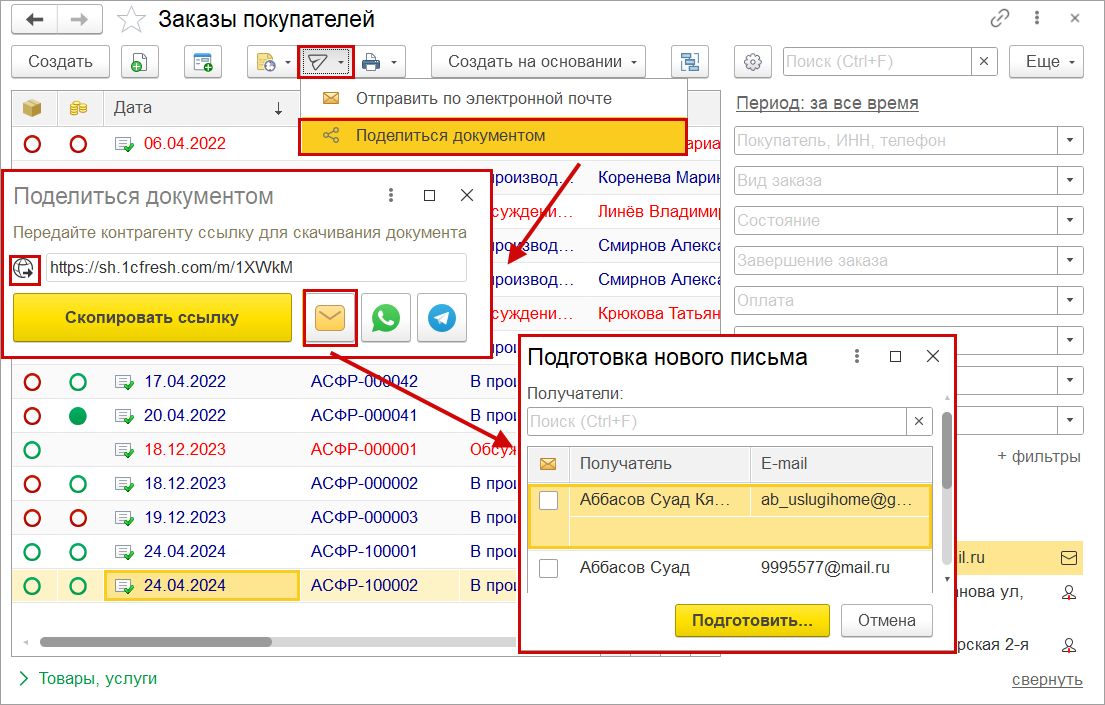 Для того чтобы получить ссылку на документ необходимо воспользоваться командой "Поделиться документом", расположенной в подменю "Отправить" документов "Заказ покупателя", "Счет на оплату". После выполнения команды откроется форма с короткой ссылкой на выгруженный в сервис документ. Ссылку можно скопировать, передать через мессенджеры или электронную почту. При передаче через электронную почту откроется форма для выбора контакта, после чего будет сформировано письмо. При отправке через WhatsApp появится список со всеми номерами адресата.