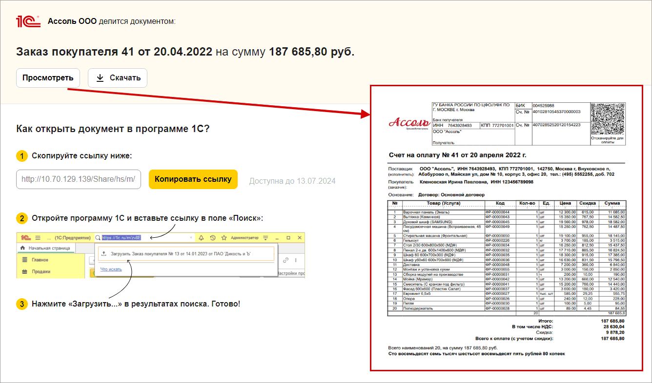 Теперь документами "Заказ покупателя", "Счет на оплату" из программы можно делиться с контрагентами при помощи сервиса "1С:Share". В списке и форме документов доступна команда "Поделиться документом", по которой открывается форма с короткой ссылкой на выгруженный в сервис документ. Ссылку можно отправлять по электронной почте, в мессенджерах WhatsApp и Telegram или копировать и отправлять любым другим способом. Есть возможность загрузить документы из сервиса по полученным от контрагентов ссылкам. Работа с сервисом "1С:Share" не требует сложной настройки и дополнительных регистраций.
