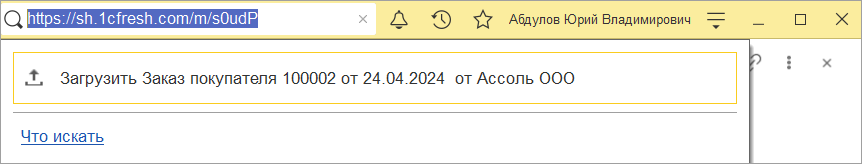 Для загрузки документа необходимо в поле поиска ввести полученную от контрагента ссылку. В результатах поиска выводится команда перехода к предпросмотру документа в веб-интерфейсе сервиса, а далее команда "Загрузить". При выполнении этой команды происходит создание документа в информационной базе.