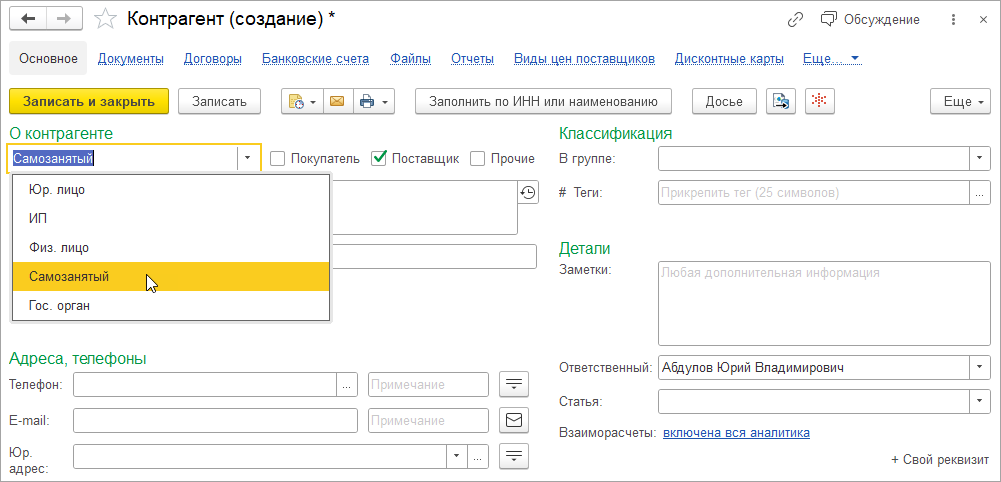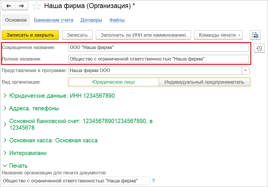 Наименование организации в карточке компании. При заполнении в карточке реквизитов организации по ИНН автоматически корректно заполняются полное и сокращенное наименование организации, а также представление. Теперь можно выбрать, какое из наименований организации будет использоваться в печатных документах.