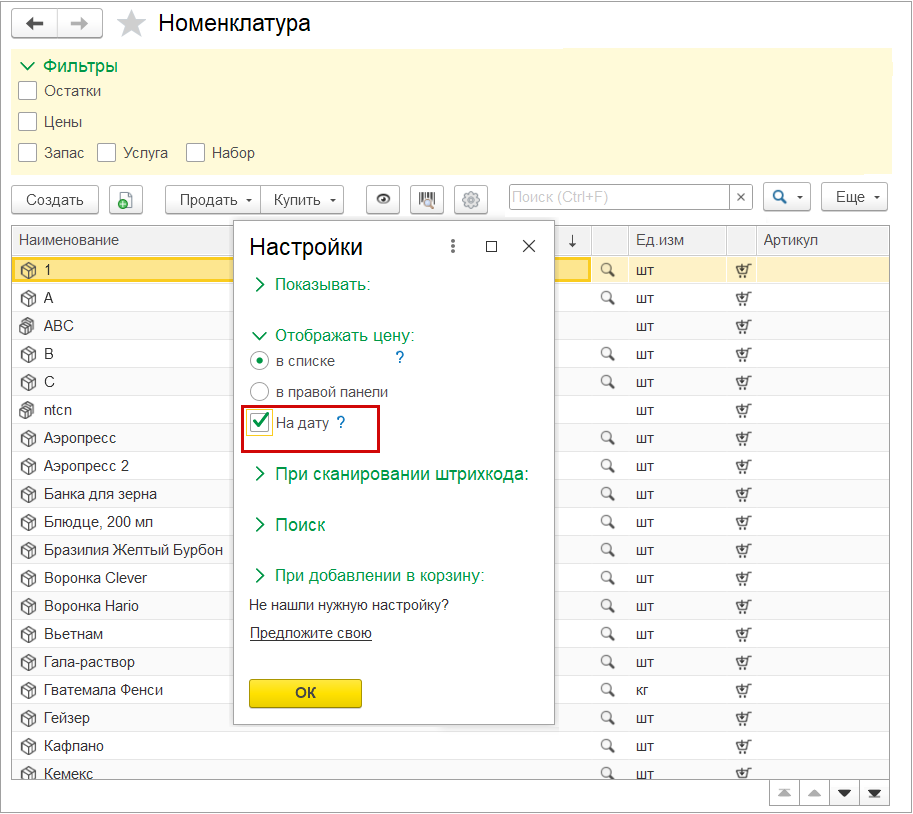 В форме подбора, выбора и списке номенклатуры появилась возможность отображать цену на текущую дату. При работе с ценой в документах правила остались прежними - используется цена номенклатуры на дату документа.