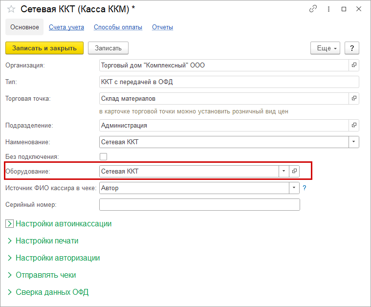 Приоритетная касса ККМ в документе "Чек ККМ". Если к одному складу привязано две кассы ККМ, то при создании документа "Чек ККМ" на основании документов "Заказ покупателя" подставляется приоритетно касса ККМ, указанная в настройках в поле "Основная касса ККМ".