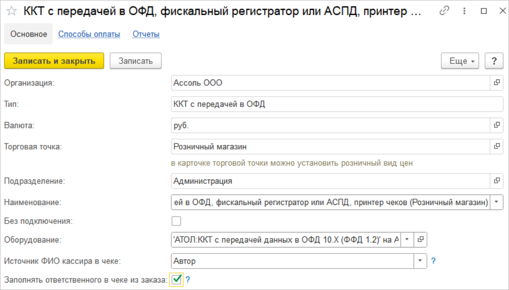 В справочнике "Кассы ККМ" добавили возможность заполнять ответственного в чеке ККМ из заказа покупателя. Для этого в карточке кассы ККМ типа "ККТ с передачей в ОФД, фискальный регистратор или АСПД, принтер чеков" устанавливаем флажок "Заполнять ответственного в чеке из заказа". В этом случае поле "Ответственный" в документе "Чек ККМ" заполняется из документа основания "Заказ покупателя".