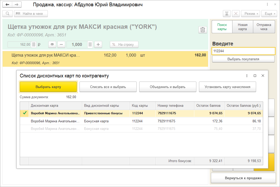 Бонусные баллы теперь можно списывать с нескольких дисконтных карт, привязанных к одному номеру телефона покупателя. Если при поиске дисконтной карты клиента нашлось несколько карт, программа покажет все карты и предложит кассиру выбрать действия с ними.