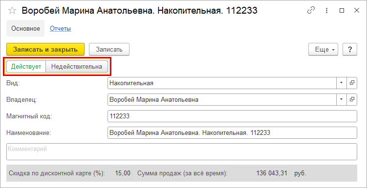 Контролировать действие дисконтных карт стало проще. В карточке дисконтной карты добавили удобный переключатель действия карты.