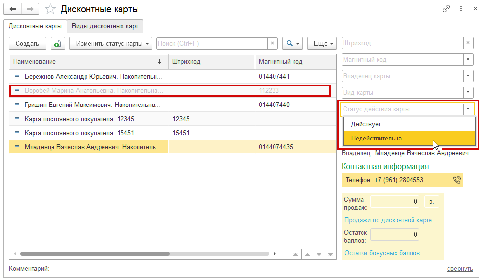 В списке дисконтных карт недействительные карты отображаются серым цветом. Для удобства кассира добавлен фильтр статуса действия карты.