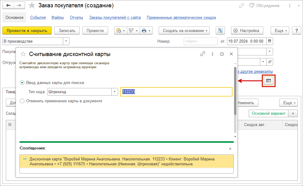 Также проверка работает при выборе карты в документах "Заказ покупателя", "Расходная накладная", "Чек ККМ".