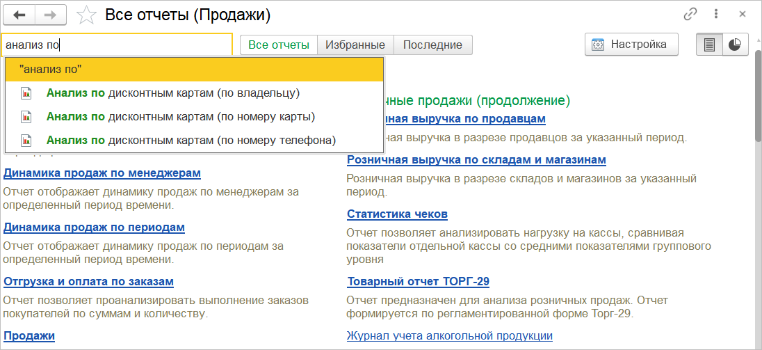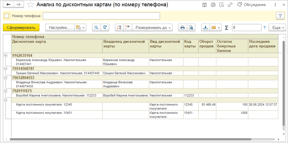 Для анализа дисконтных карт и выявления дублей добавлен отчет "Анализ по дисконтным картам" с тремя вариантами группировки: по владельцу, номеру карты и номеру телефона.