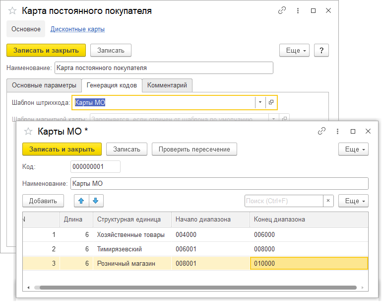 Важно! Если шаблон нумерации настраивается для вида дисконтных карт, к которому уже привязаны карты, необходимо убедиться, что номера созданных ранее карт находятся в диапазоне шаблона.