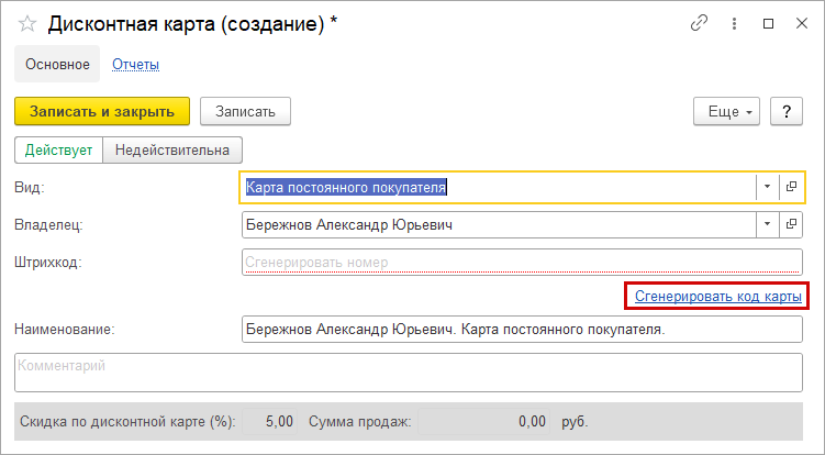 В настройки вида дисконтной карты (Продажи – Цены и скидки – Дисконтные карты – Виды дисконтных карт) добавлен флажок "Генерировать номер". Если флаг установлен, то при создании новой карты ей автоматически присваивается номер по заданному шаблону.