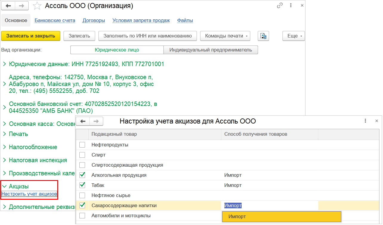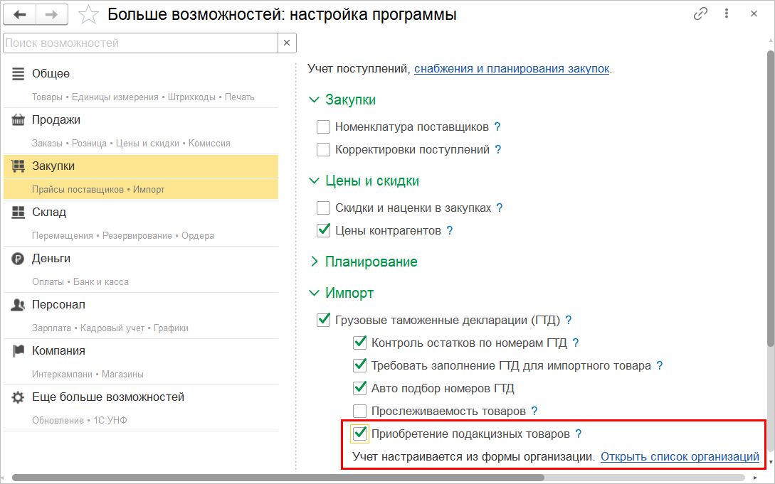 После включения импорта становится доступна ссылка для перехода к списку организаций. Настройка учета акцизов выполняется для каждой организации.