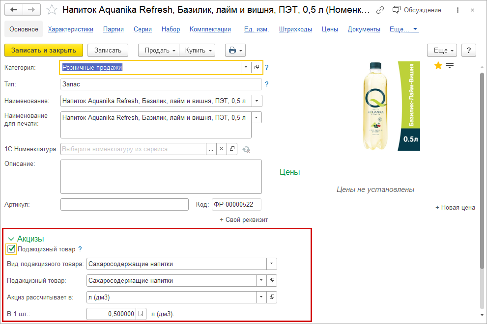 В карточке товара появляется группа "Акцизы" с информацией о подакцизном товаре и данными для расчета акциза.