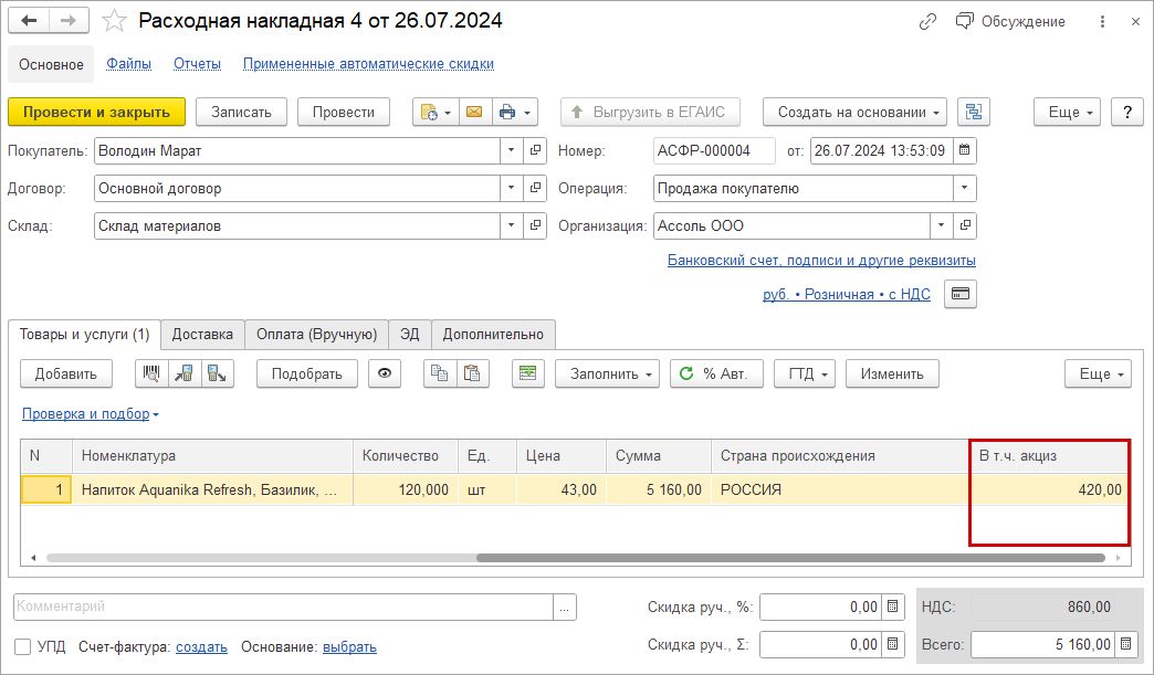 Значение в поле "В т.ч. акциз" рассчитывается автоматически как произведение количества товаров в строке на ставку акциза.