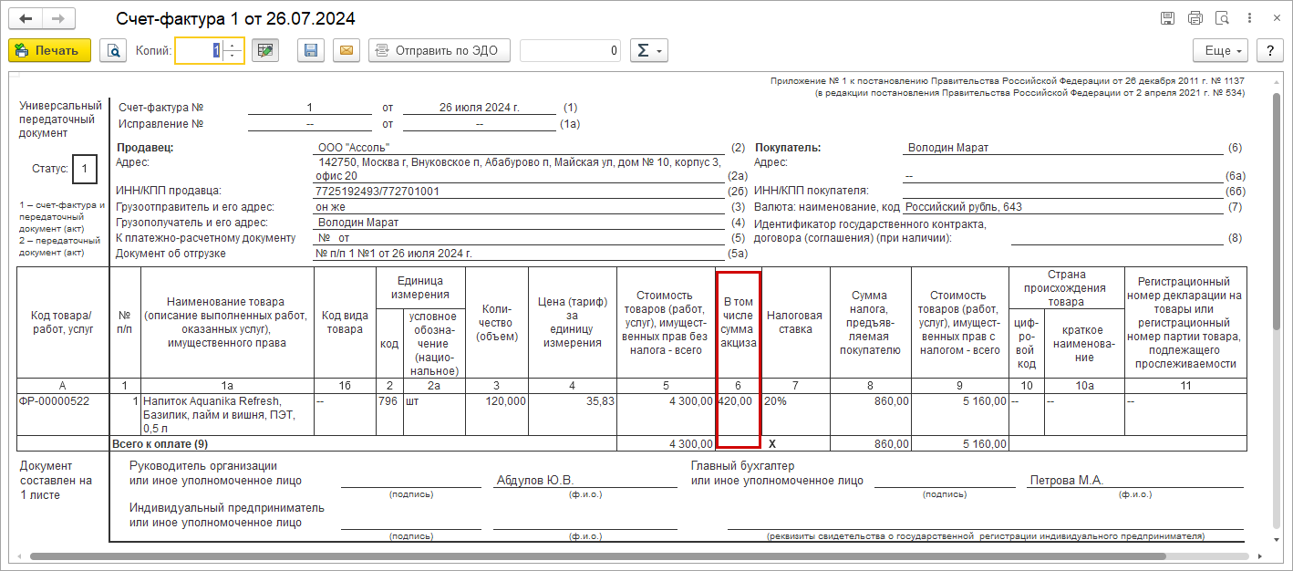 Сумма акциза заполняется в печатной форме УПД (универсального передаточного документа) и счета-фактуры, в том числе корректировочных.