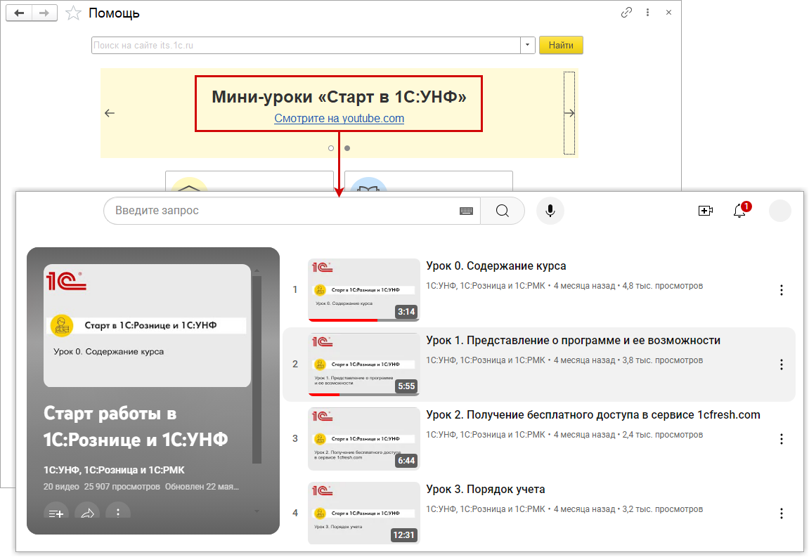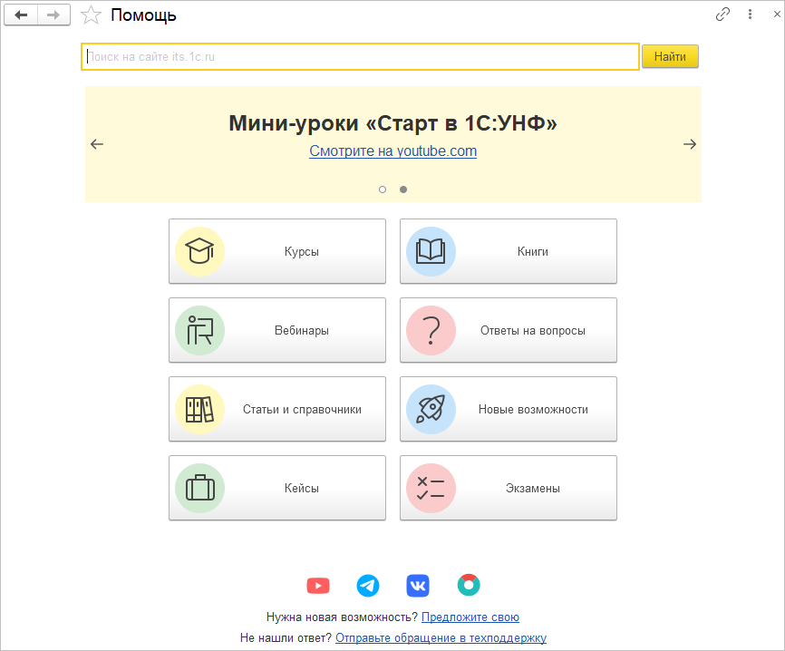 Самые важные и актуальные материалы версии располагаются в верхнем баннере. Например, нашего нового мини-курса для начинающих "Старт работы в 1С:Рознице и 1С:УНФ".