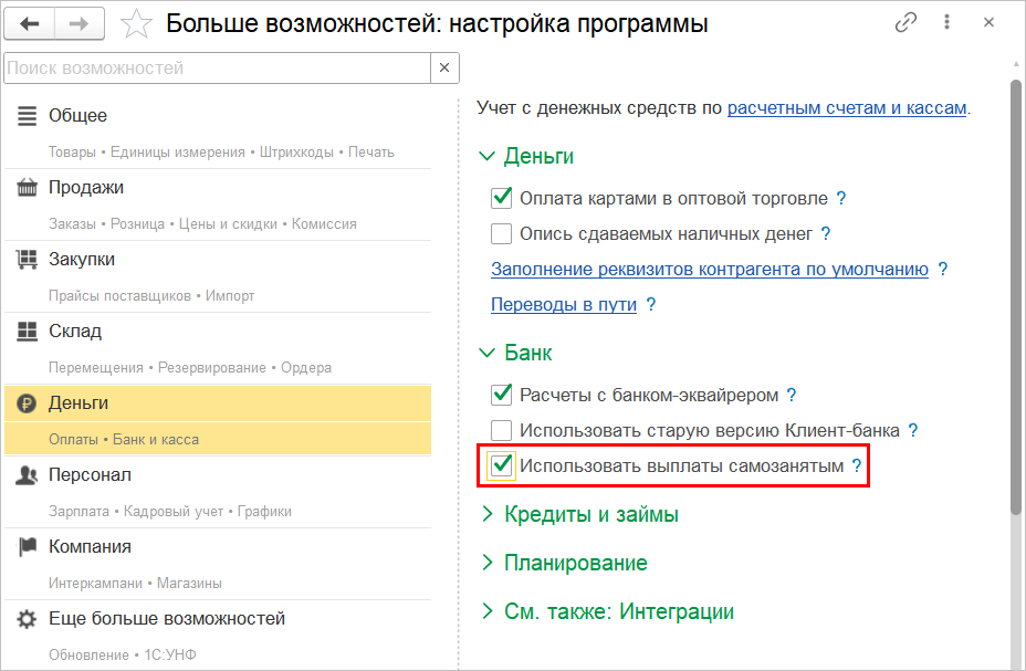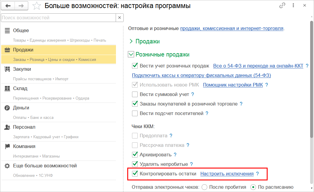 Настройка контроля остатков выполняется в разделе: Настройки – Еще больше возможностей – Продажи. При установке флажка "Контролировать остатки" в группе "Розничные продажи" становится доступна ссылка "Настроить исключения".