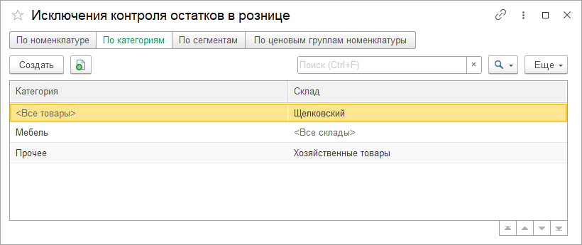 Контроль остатков в рознице теперь можно отключить для определенного склада или магазина, а также сегмента, категории, ценовой группы или отдельного товара. Такая опция позволит пробить чек и сформировать отчет о розничных продажах даже если товара нет в наличии. Возможность будет полезна, если в чек включены товары, остатки по которым не отражены в учетной системе.
