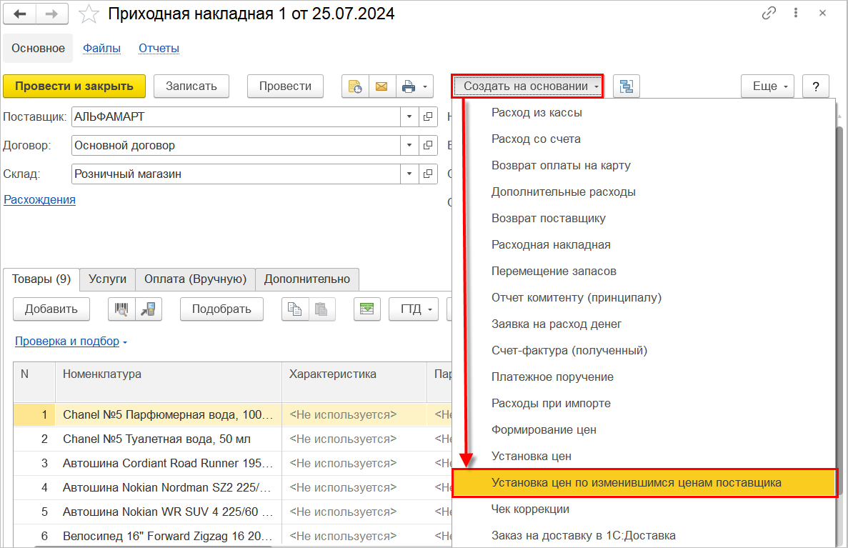 Документ автоматически заполнится только товарами с обновленными ценами.