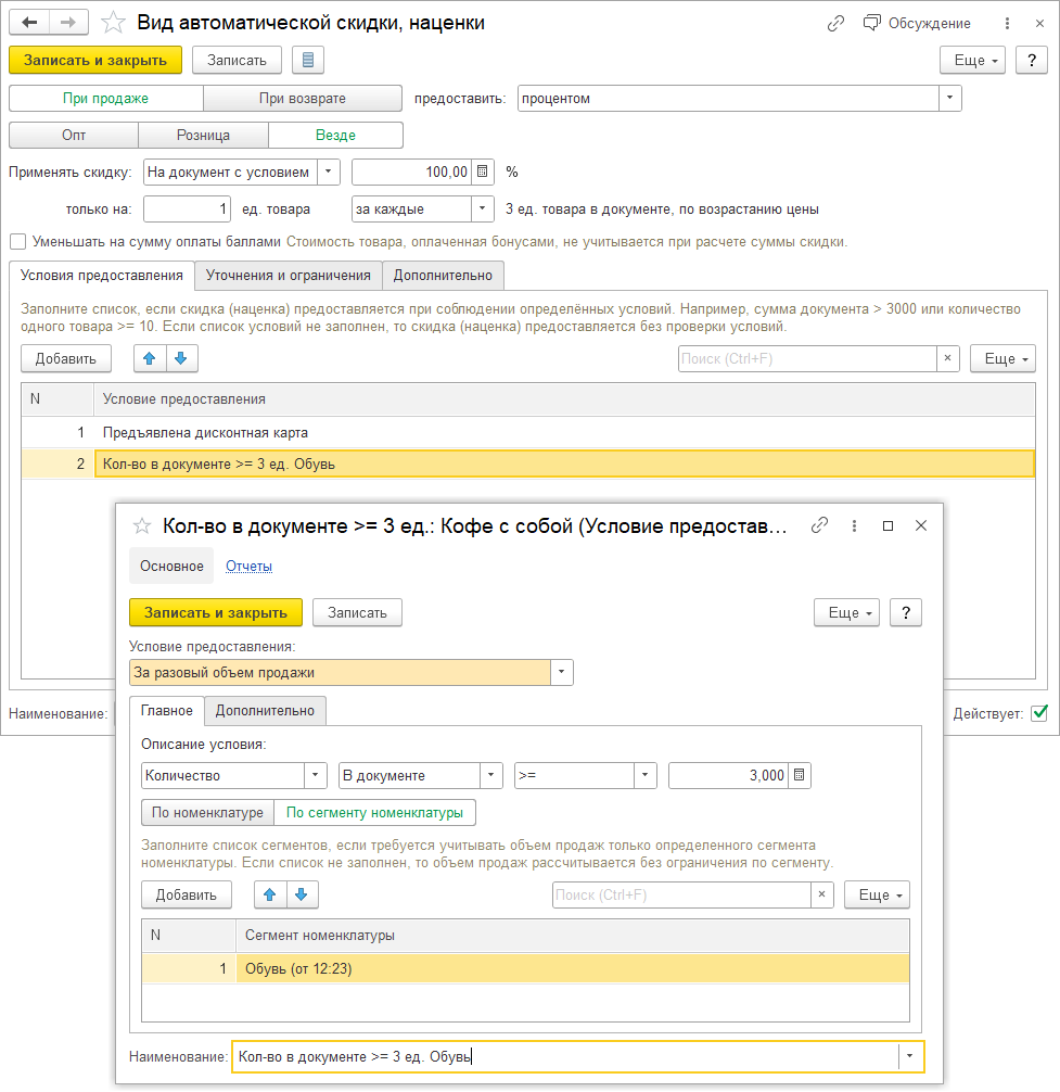 Появилось больше сценариев предоставления скидок для акций "купи два товара одной группы – получи третий бесплатно" или "третий товар со скидкой 50%". Такие скидки теперь настраиваются намного проще, для варианта "предоставить: процентом" добавлены способы применения "на документ с условием" и "на строку с условием".