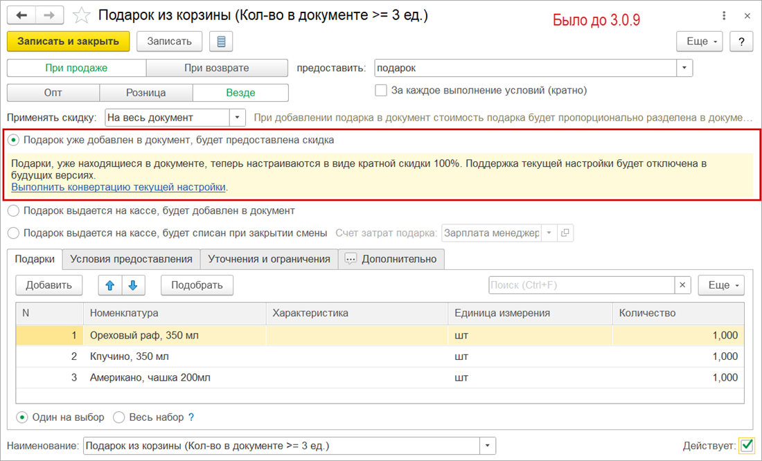 Если ранее уже была настроена скидка "2+1"с помощью подарков, программа предложит ее конвертировать в новую.