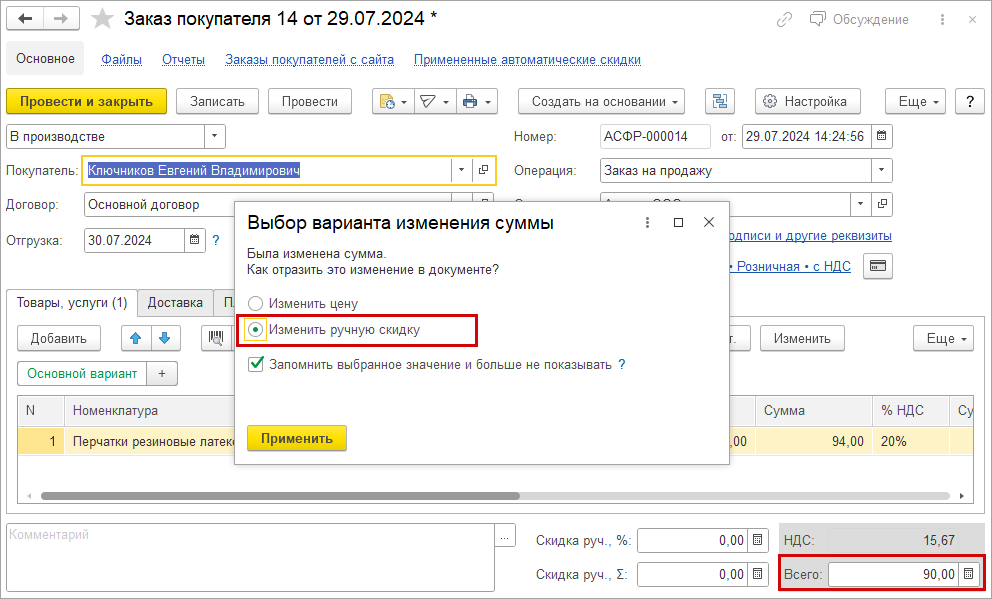При редактировании поля "Всего" или "Сумма" открывается диалог с выбором варианта изменения суммы: скидкой или изменением цен. Есть возможность сохранить основной сценарий расчета с помощью флажка.