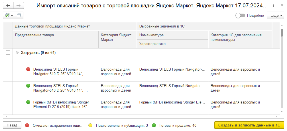 Если товар не удалось загрузить, будет выведена информация об ошибке, напротив товара отобразится чекбокс. Такой товар можно исправить, отметить флажком и загрузить по кнопке "Создать и записать данные в 1С".