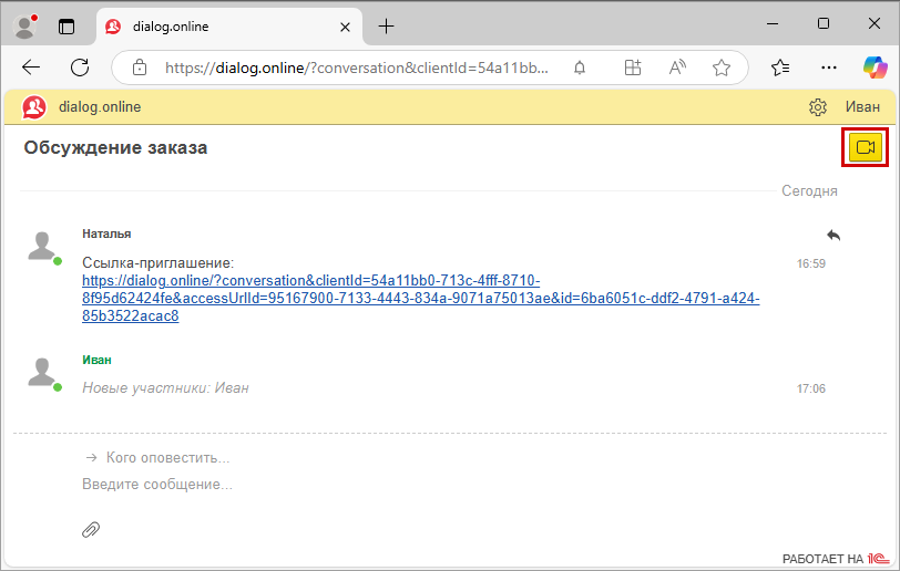 Менеджер в обсуждении в 1С:УНФ может писать сообщения, инициировать видеозвонок или переходить к звонку с ожидающим клиентом.