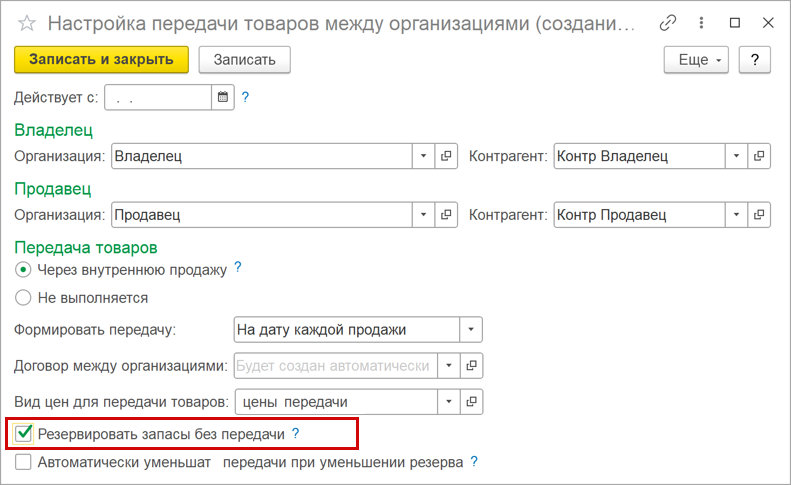 В форме настройки передач между организациями появился новый флажок "Резервировать запасы без передачи".