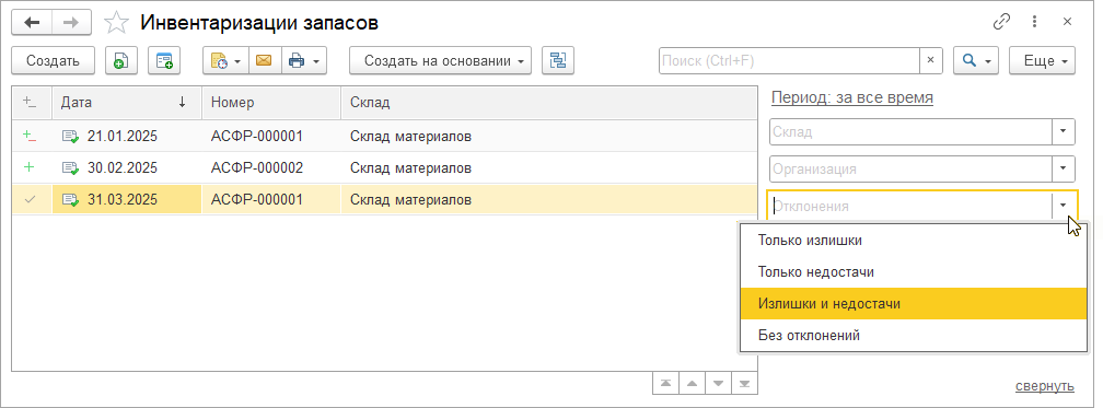 Также к списку документов добавлена правая панель с фильтрами. С ее помощью можно отобрать документы одного склада, организации или быстро найти документы, в которых выявлены отклонения.
