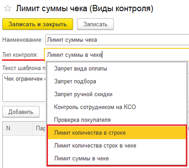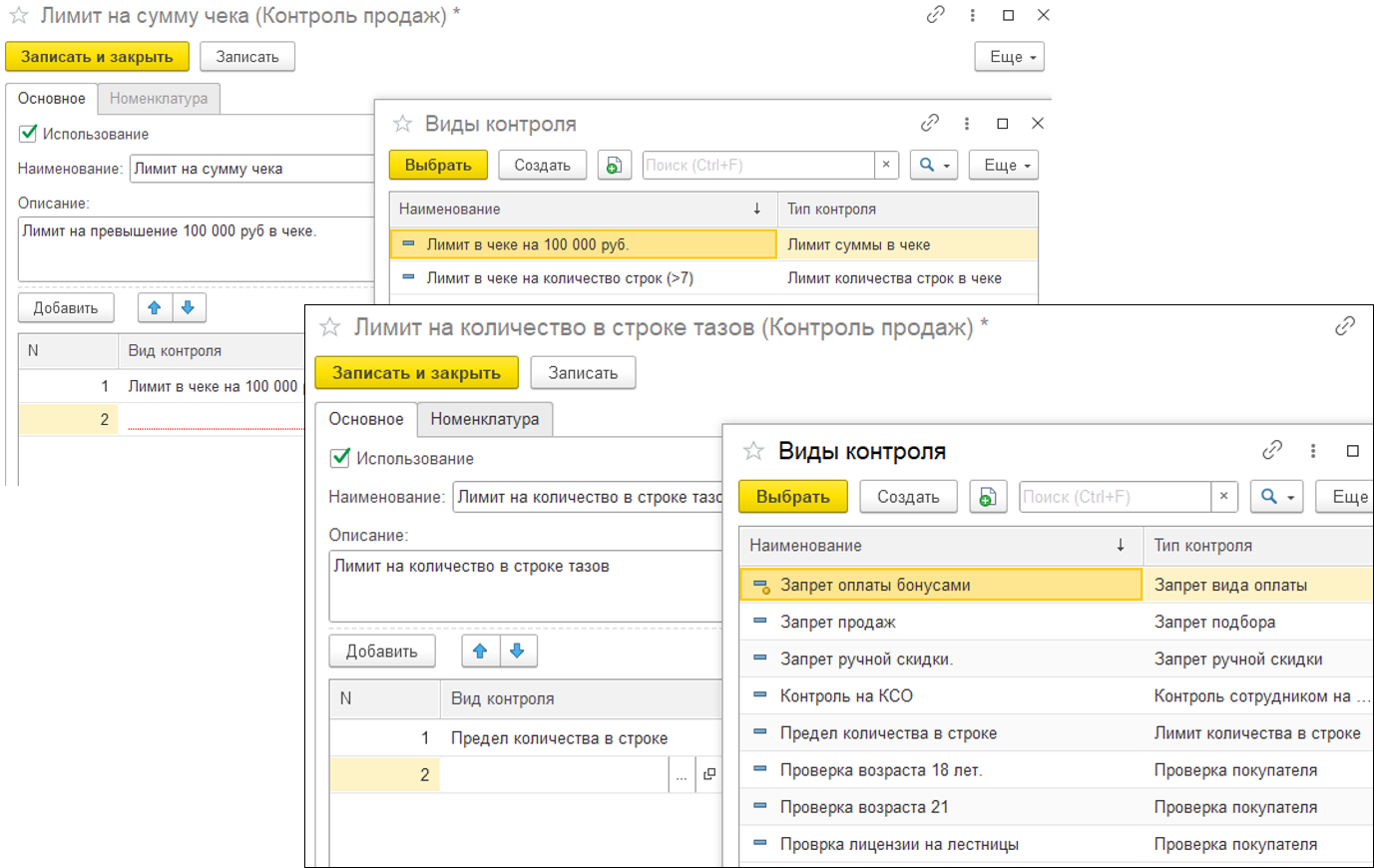 Теперь элемент справочника "Контроль продаж" может содержать одновременно только виды контроля, относящиеся либо к строкам товаров, либо ко всему чеку. Доступные к добавлению виды контроля зависят от первого выбранного вида контроля.