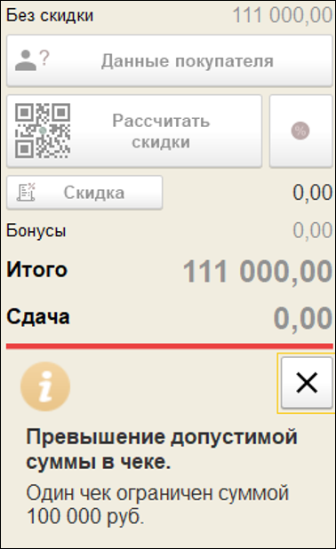Добавили возможность устанавливать максимальное количество строк и общую сумму чека. Это поможет избежать случайных ошибок кассиров и возможных ограничений кассовых аппаратов по печати чека.