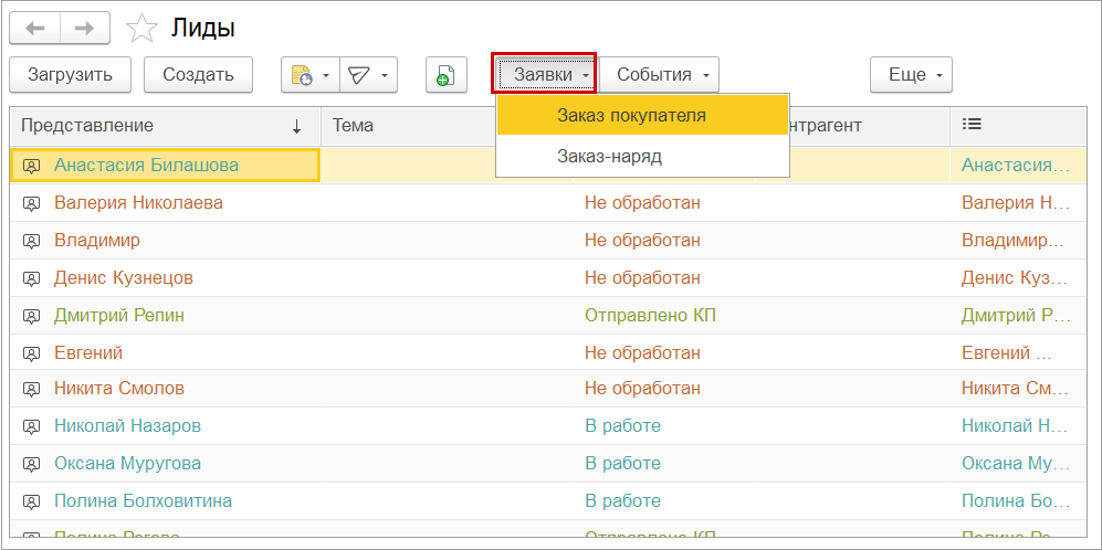 Для создания коммерческого предложения лиду перейдите к списку лидов в разделе CRM, выберите лида, по кнопке "Заявки" выберите "Заказ покупателя" или "Заказ-наряд".