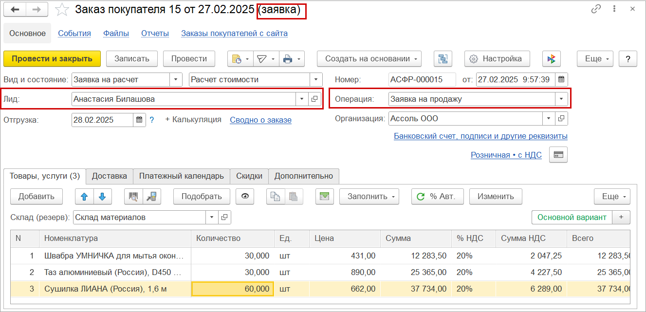 Автоматически сформируется документ "Заказ покупателя" с видом операции "Заявка на продажу". Отличие такого документа от обычного заказа в том, что заявка не формирует движений, а в шапке документа будет отражен не покупатель, а лид. Документ следует заполнить по аналогии с обычным заказом: заполнить табличную часть, затем нажать "Провести".
