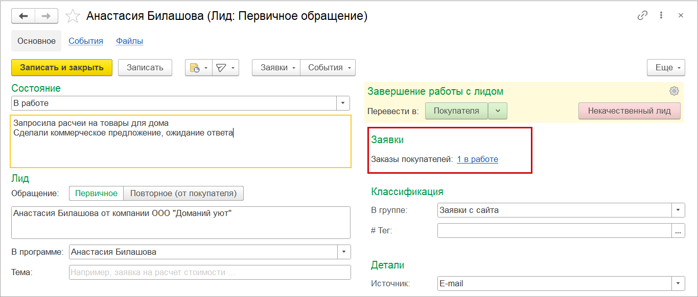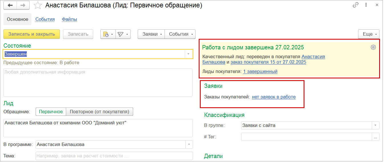 Лид будет отмечен как качественный, заказ покупателя как результат работы с лидом отразится в карточке лида.