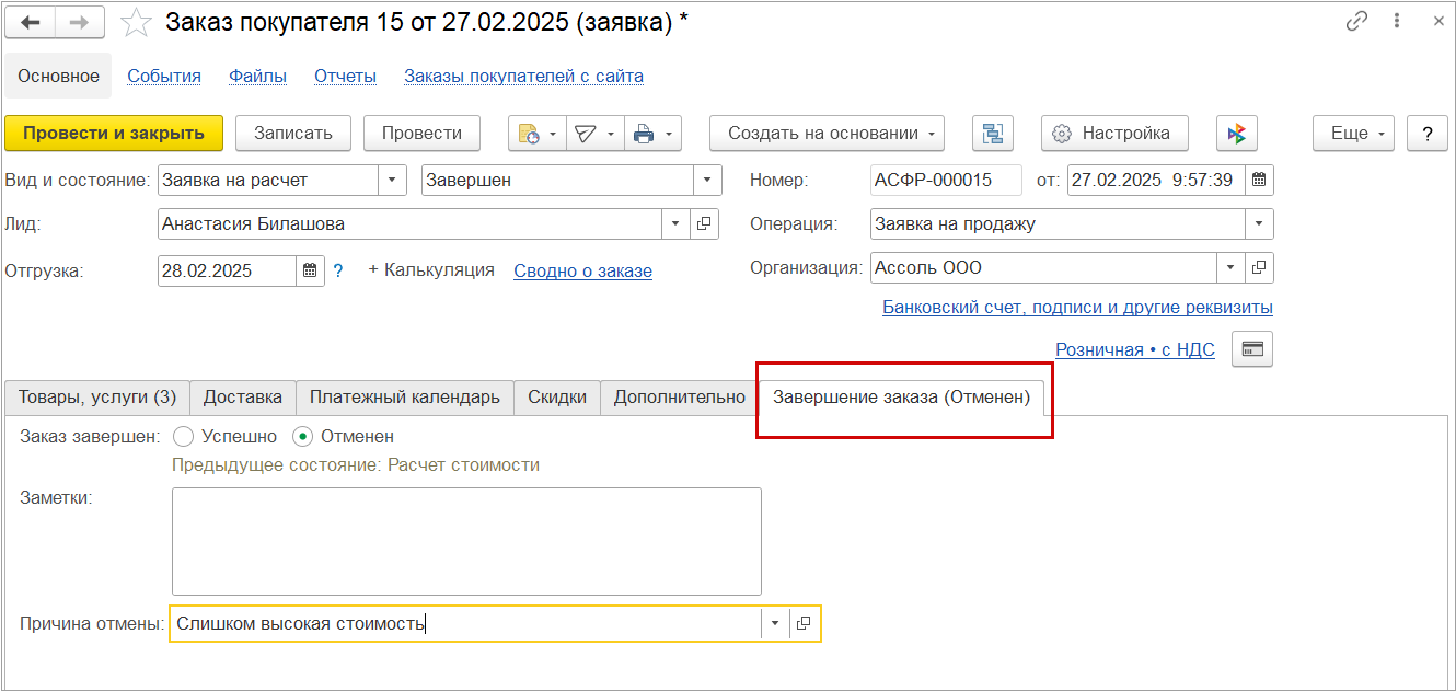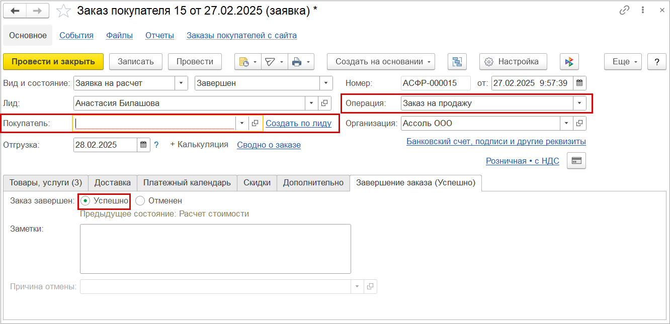 Если клиент согласился с условиями и готов сделать заказ, переведите документ в состояние "Завершен" и на закладке "Завершение заказа" выберите вариант "Успешно". Вид операции автоматически изменится на "Заказ на продажу". В документе появится поле "Покупатель". В поле можно выбрать существующего покупателя или выбрать вариант "Создать по лиду". В программе будет создан покупатель по данным лида.
