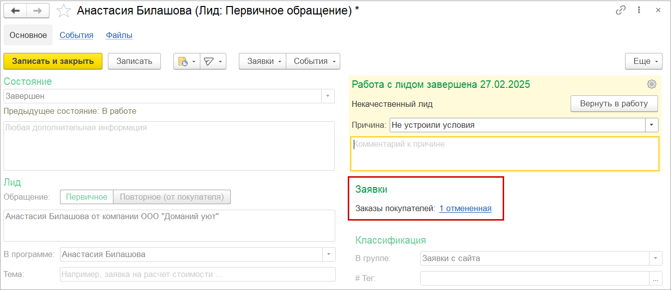 Все отмененные заявки отобразятся в карточке лида. Если лид не принял ни один из предложенных вариантов, лида следует отметить как некачественного.