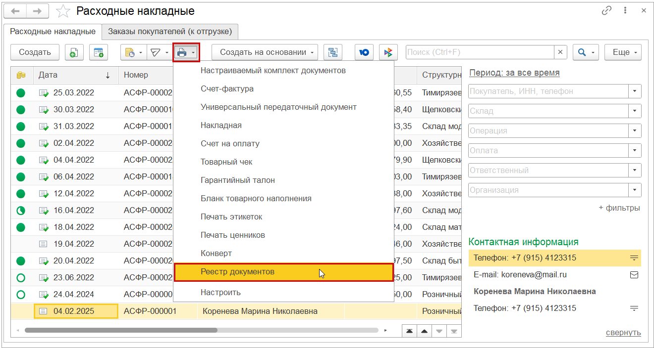 В списке документов по кнопке "Печать с предварительным просмотром" выберите вариант "Реестр документов".