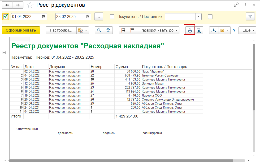 Настройте отчет по сумме, организации, документам, периоду установкой соответствующих фильтров. Далее результат отчета можно распечатать по одноименной кнопке.