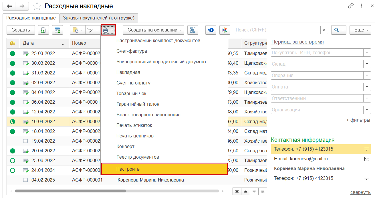 Добавили возможность гибкой настройки печатных форм. Можно изменить порядок документов в списке, скрыть неиспользуемые. Настройка выполняется индивидуально для каждого пользователя. Возможность доступна для документов "Расходная накладная", "Заказ покупателя" и "Заказ-наряд".