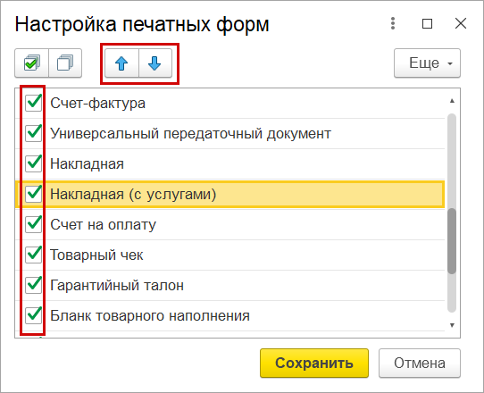 В форме настроек установите флажки для форм, которые необходимо отобразить в списке. По кнопке с изображением стрелок установите очередность отображения. Нажмите "Сохранить".