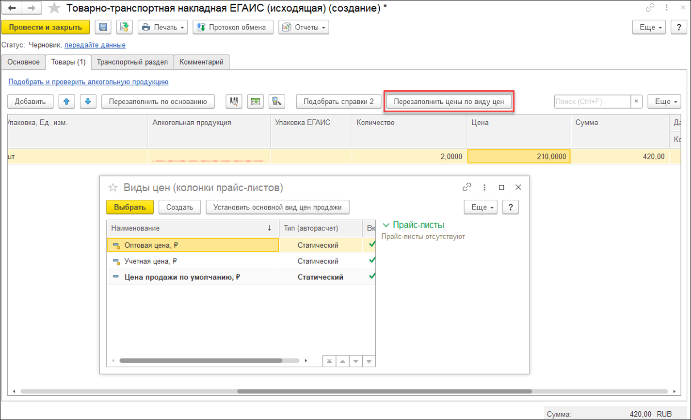 Поддержали заполнение цен в документе "ТТН Исходящая ЕГАИС", введенной на основании документа "Перемещение запасов". В документе можно "перезаполнить цены по виду цен", после чего цена и сумма документа примут новые значения.