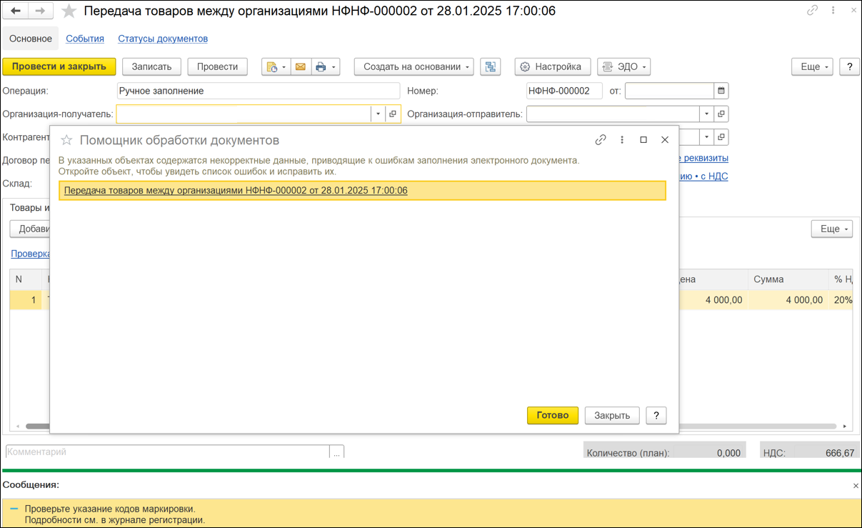 Добавили проверку соответствия маркируемых товаров кодам маркировки перед формированием электронного документа. Теперь, если при оформлении электронного УПД из документа "Расходная накладная" или "Передача между организациями" коды марки не будут соответствовать товарам, программа выведет предупреждение с указанием причины.