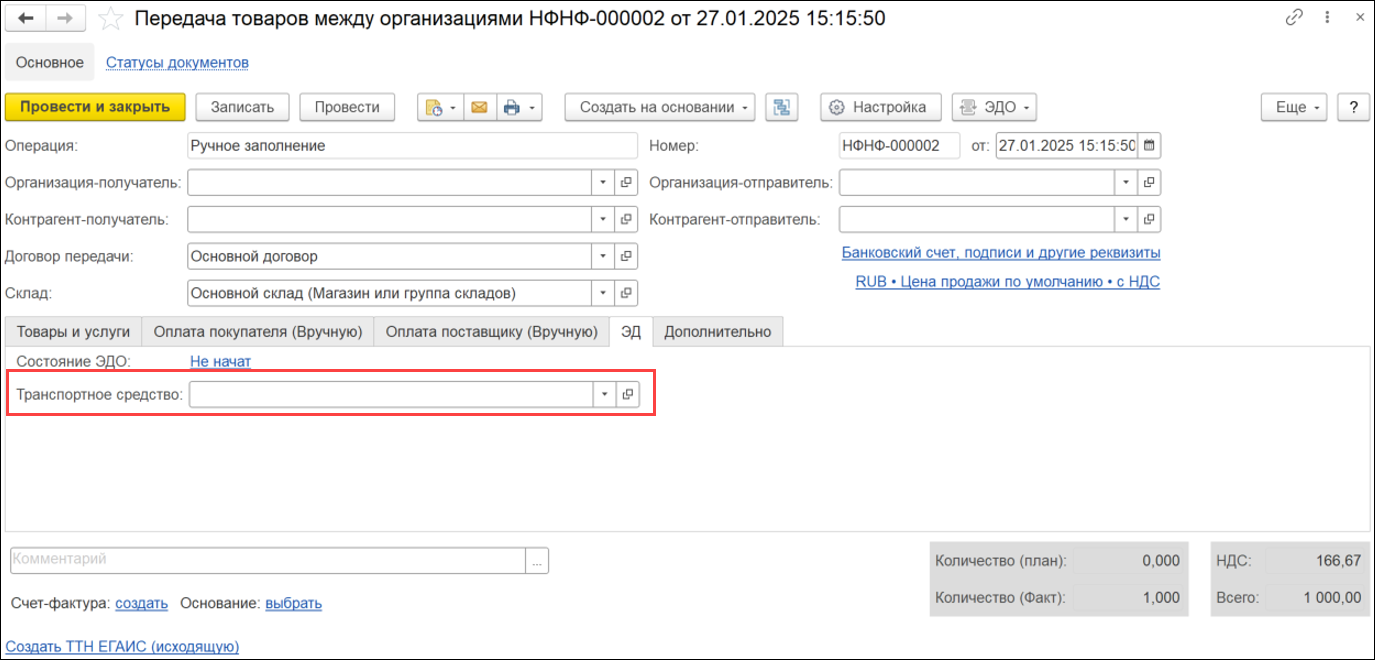 Значения полей "Дата транспортного документа" и "Номер транспортного документа" определяются автоматически из "ТТН Исходящей ЕГАИС". Если документ "ТТН Исходящая ЕГАИС" не сформирован, то данные заполнятся номером и датой самого документа и переносятся в документ "ТТН Исходящая ЕГАИС". Для автоматического заполнения данных транспортного документа можно использовать идентификатор электронной транспортной накладной, указанный в разделе "Компания" - "Электронные документы". Если информация о перевозочном документе не заполнена, то, начиная с даты контроля при формировании УПД формата 5.02 с пивной продукцией, будет выведено предупреждение.