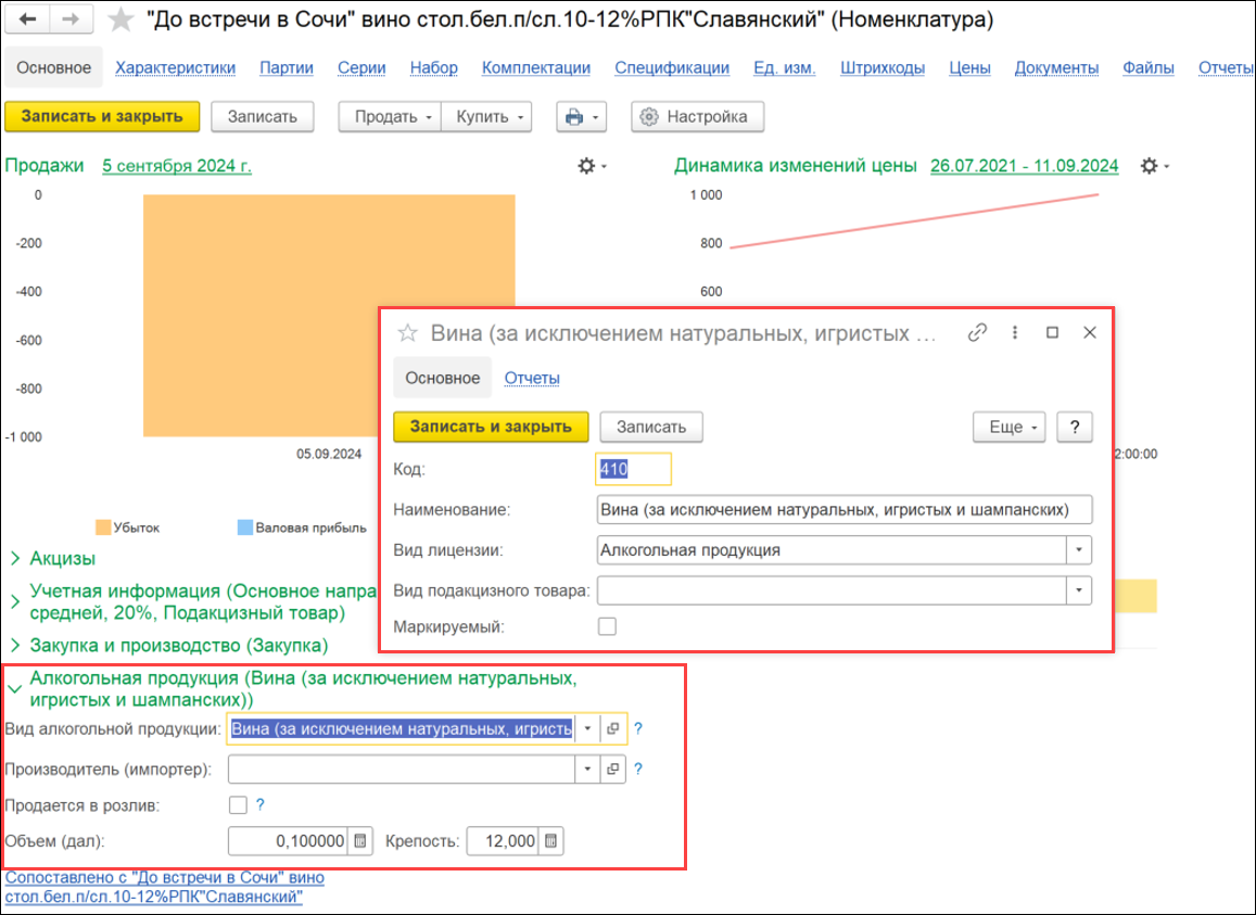 В карточке номенклатуры должен быть заполнен "Вид алкогольной продукции", так как для разделения по отчетам анализируется "Вид лицензии". Также нужно указать "Объем (дал). Количество для отчета пересчитывается согласно объему.