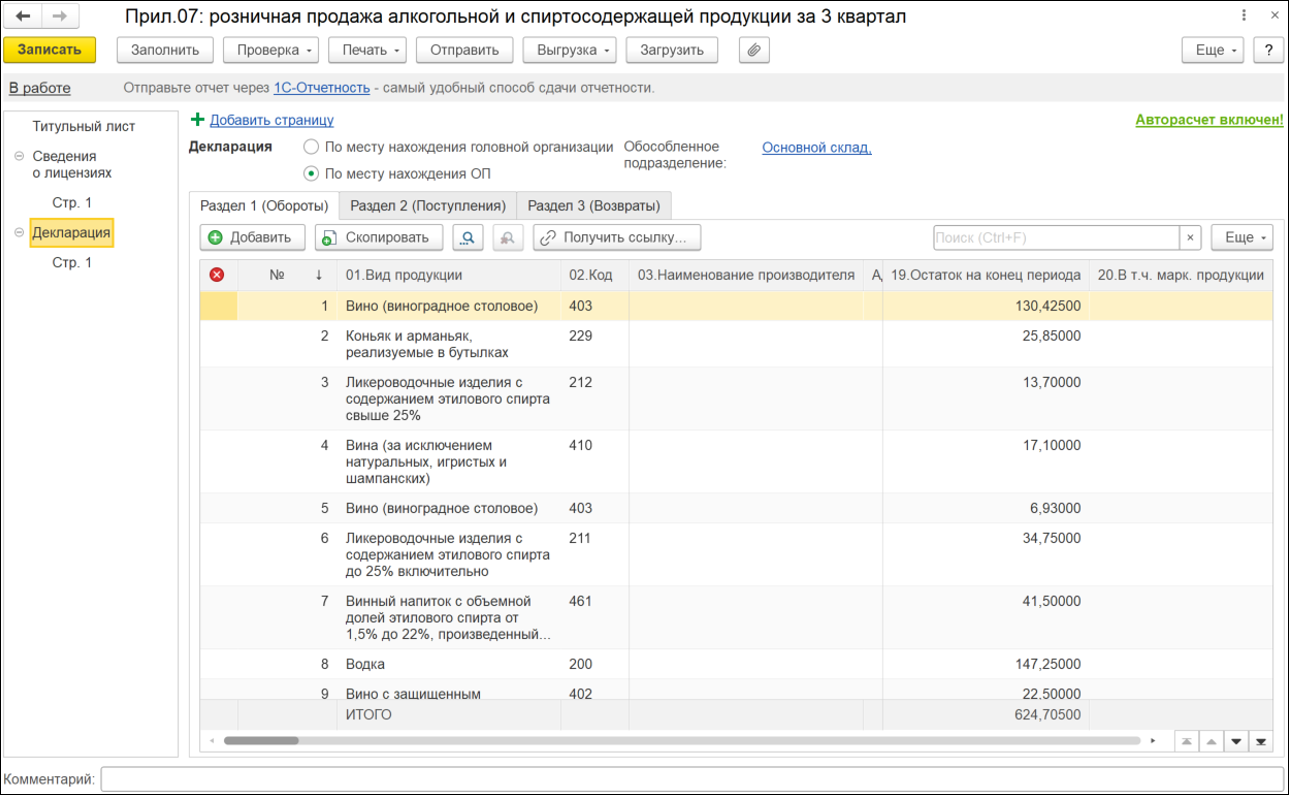 В отчет "Прил.07: розничная продажа алкогольной и спиртосодержащей продукции" попадают данные по оборотам, поступлениям и возвратам товаров, для которых "Вид лицензии" не соответствует значению "Пиво". Здесь заполняются "Титульный лист", "Раздел 1 (Обороты)", "Раздел 2 (Поступления)" и "Раздел 3 (Возвраты)".