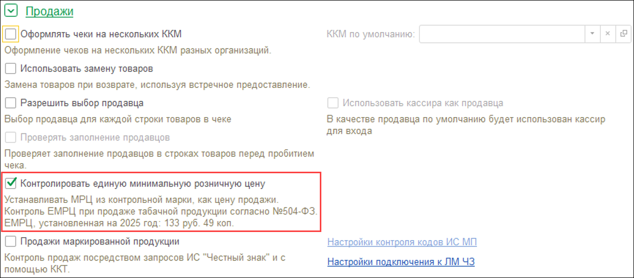 Контролировать цены подакцизных товаров стало проще. Алкоголь и табак имеют ЕМРЦ (единую минимальную розничную цену) ниже которой продавать запрещено, а табак дополнительно - МРЦ (максимальную розничную цену) – фактически единственную доступную к продаже цену. Для соблюдения этих ограничений в настройках РМК предусмотрена опция "Контролировать единую минимальную розничную цену".