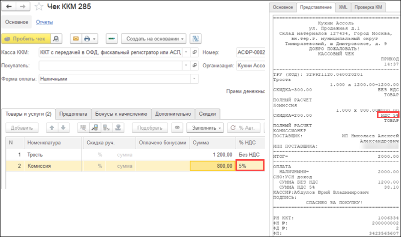 Чеки пробиваются стандартным образом. Для выделения НДС при комиссионной торговле в карточку партии товара добавлен параметр "ставка НДС".