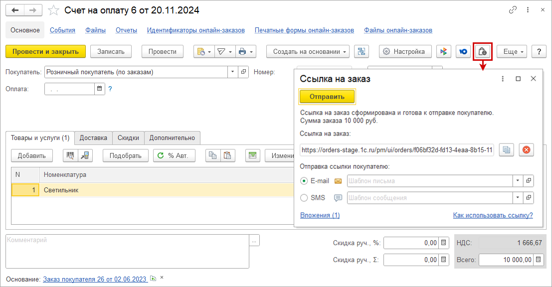 Получать оплату по счетам стало быстрее и удобнее. Из документа "Счет на оплату" теперь также можно создать ссылку на счет и поделиться ей с клиентом. В документ добавлена кнопка "Онлайн-заказ".