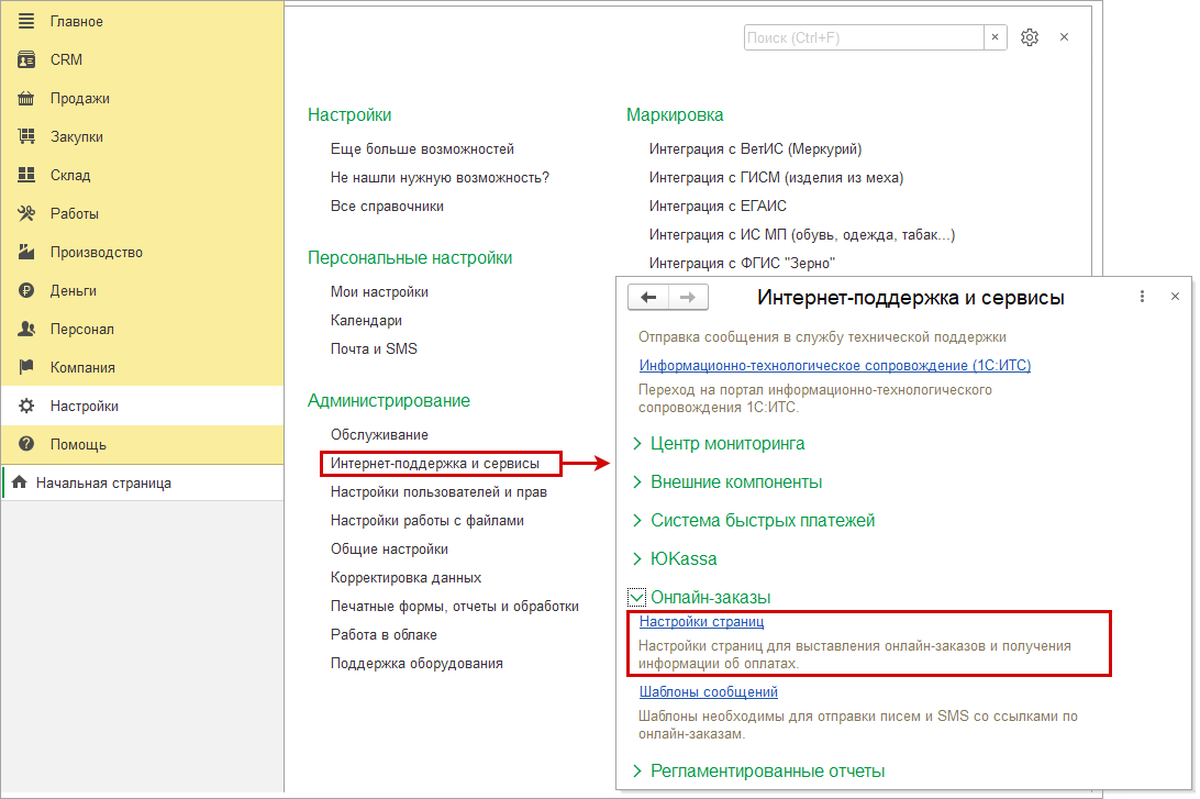 Подключение к онлайн-заказам выполняется в разделе Настройки – Администрирование – Интернет-поддержка и сервисы – Онлайн-заказы – Настройки страниц.
