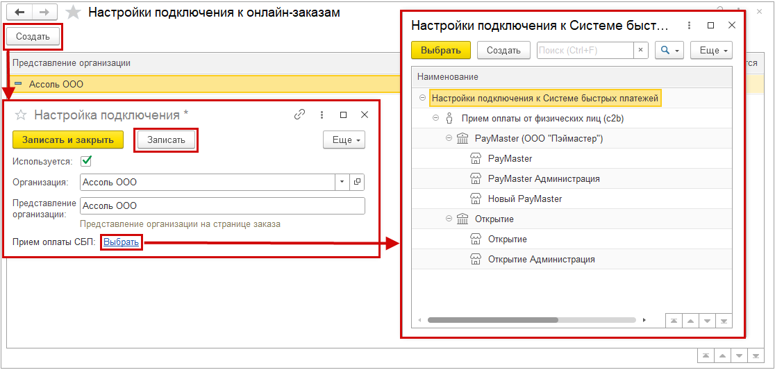 По кнопке "Создать" откройте форму "Настройки подключения". Выберите организацию и подключение к СБП.